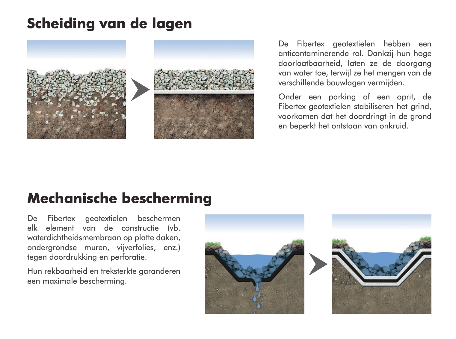 Scheiding van lagen: voorkomt vermenging van funderingslagen en stabiliseert grind onder opritten, parkings en terrassen.